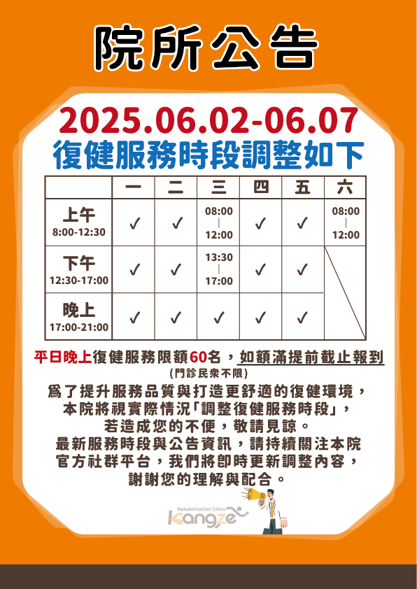 【院所公告】114年6月2日及6月7日復健服務名額調整公告