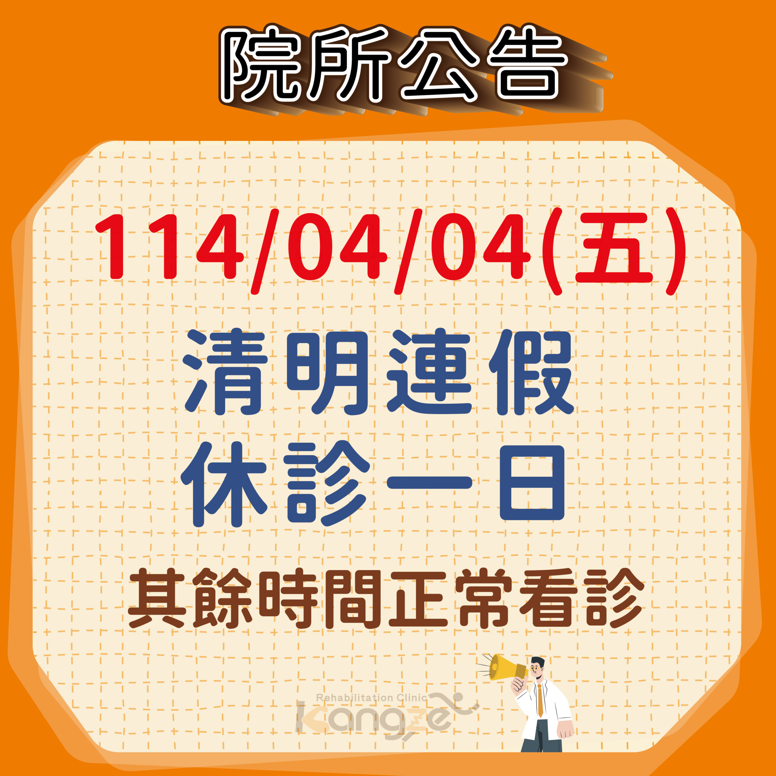 【院所公告】114年4月04日清明連假休診公告2025.3.13【院所公告】 114年04月04日清明連假,休診一日 林口冠雅復健科診所與您健康同行 迎向更健康快樂的生活👣 – 💕林口冠雅復健科.您邁向健康快樂的好夥伴💕 https://linkouguanyamed.com/wp-content/uploads/sites/7/2025/03/清明_康澤公告_FB_非康澤-scaled.jpg 2560 2560 fengze.bd https://linkouguanyamed.com/wp-content/uploads/sites/7/2024/12/1210LOGO.jpg fengze.bd2025-03-13 14:27:582025-03-13 14:27:58【院所公告】114年4月04日清明連假休診公告