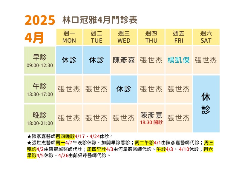 。週四早診4/3由何韋德醫師代診、午診4/3、 4/10休診;