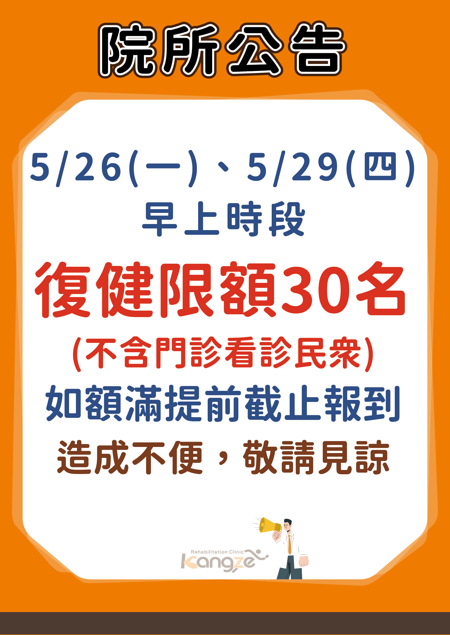 【院所公告】114年5月26日及5月29日復健服務名額調整公告