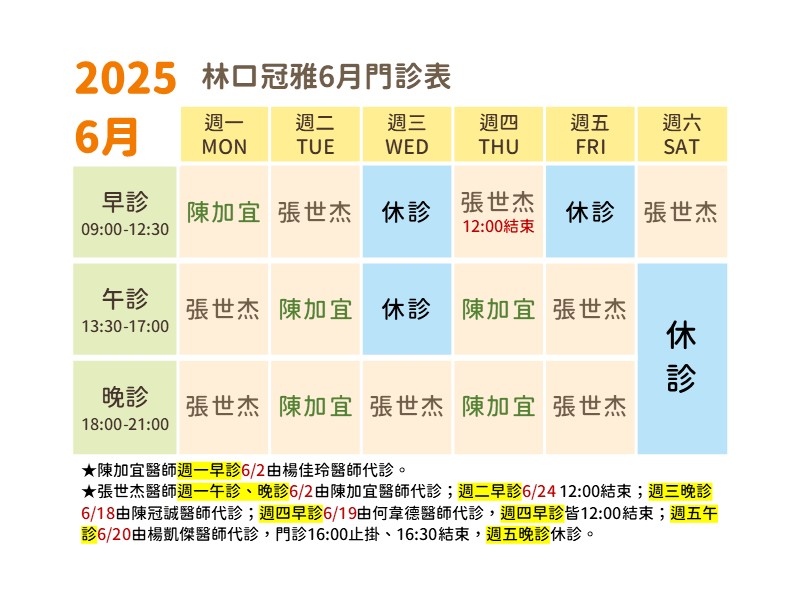 【林口冠雅復健科診所114年6月門診表】
