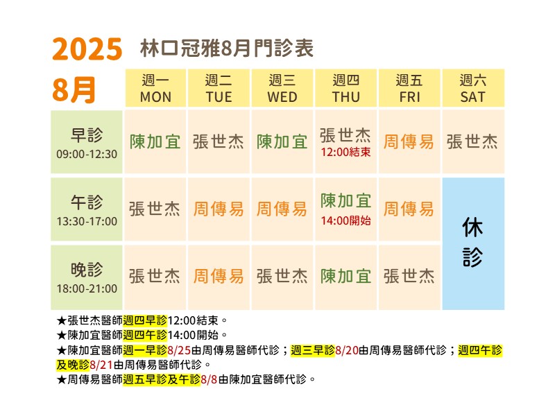 ★陳加宜醫師週一早診8/25由周傳易醫師代診;週三早診8/20由周傳易醫師代診;週四午診及晚診8/21由周傳易醫師代診。
