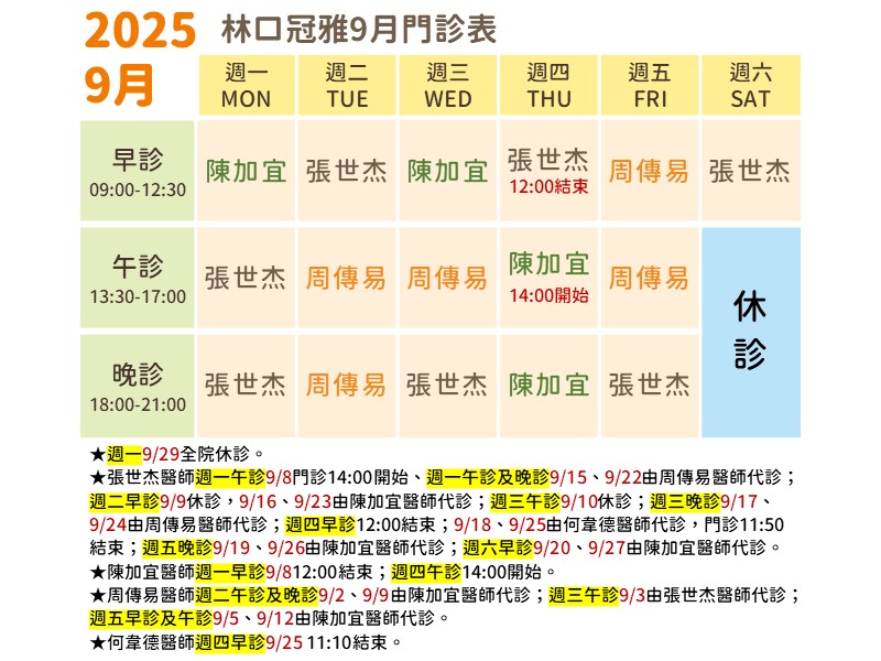 週四早診12:00結束;9/18、9/25由何韋德醫師代診,門診11:50結束;