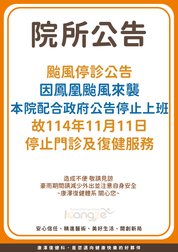 【114年11月11日颱風停診公告】2025.11.10【停診公告】 🚨114年11月11日(二)颱風停診公告🚨 因鳳凰颱風來襲,本院配合政府公告 114年11月11日(二)停止上班 故本院暫停看診、復健一日 造成不便,敬請包涵 – 💕林口冠雅復健科.您邁向健康快樂的好夥伴💕 https://linkouguanyamed.com/wp-content/uploads/sites/7/2025/11/1111颱風假-林口冠雅.png 842 596 fengze.bd https://linkouguanyamed.com/wp-content/uploads/sites/7/2024/12/1210LOGO.jpg fengze.bd2025-11-10 21:32:512025-11-10 21:32:51【114年11月11日颱風停診公告】