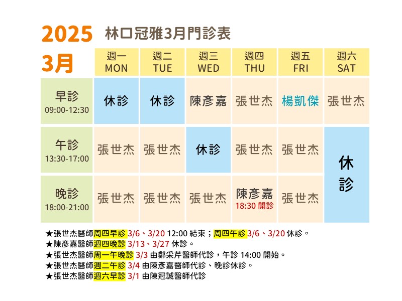 【林口冠雅復健科診所114年3月門診表】2025.2.27【林口冠雅復健科診所114年3月門診表】 林口冠雅復健科診所服務項目: 健保門診與復健 物理治療 職能治療 語言治療 疼痛治療 兒童早療 中風與神經復健 運動醫學 心肺復健 癌症復健 兒童早療家長口碑好評 Google商家4.8顆星的優質評價 林口冠雅復健科.您邁向健康快樂的好夥伴 貼心提醒~ 林口冠雅復健科為健保門診 初次看診可致電預約掛號 後續複診則可網路或電話預約掛號 期待為您服務! ———————————- #林口冠雅復健科診所 桃園市龜山區文化二路59號 歡迎來電:03 271 9130 初診不適用網路掛號、電話掛號,請前往現場掛號 歡迎加入LINE好友進行複診掛號:https://lin.ee/QVZnCyA – 林口冠雅復健科.您邁向健康快樂的好夥伴 https://linkouguanyamed.com/wp-content/uploads/sites/7/2025/02/08林口冠雅1140301.jpg 600 800 fengze.bd https://linkouguanyamed.com/wp-content/uploads/sites/7/2024/12/1210LOGO.jpg fengze.bd2025-02-27 17:10:322025-02-27 17:10:32【林口冠雅復健科診所114年3月門診表】